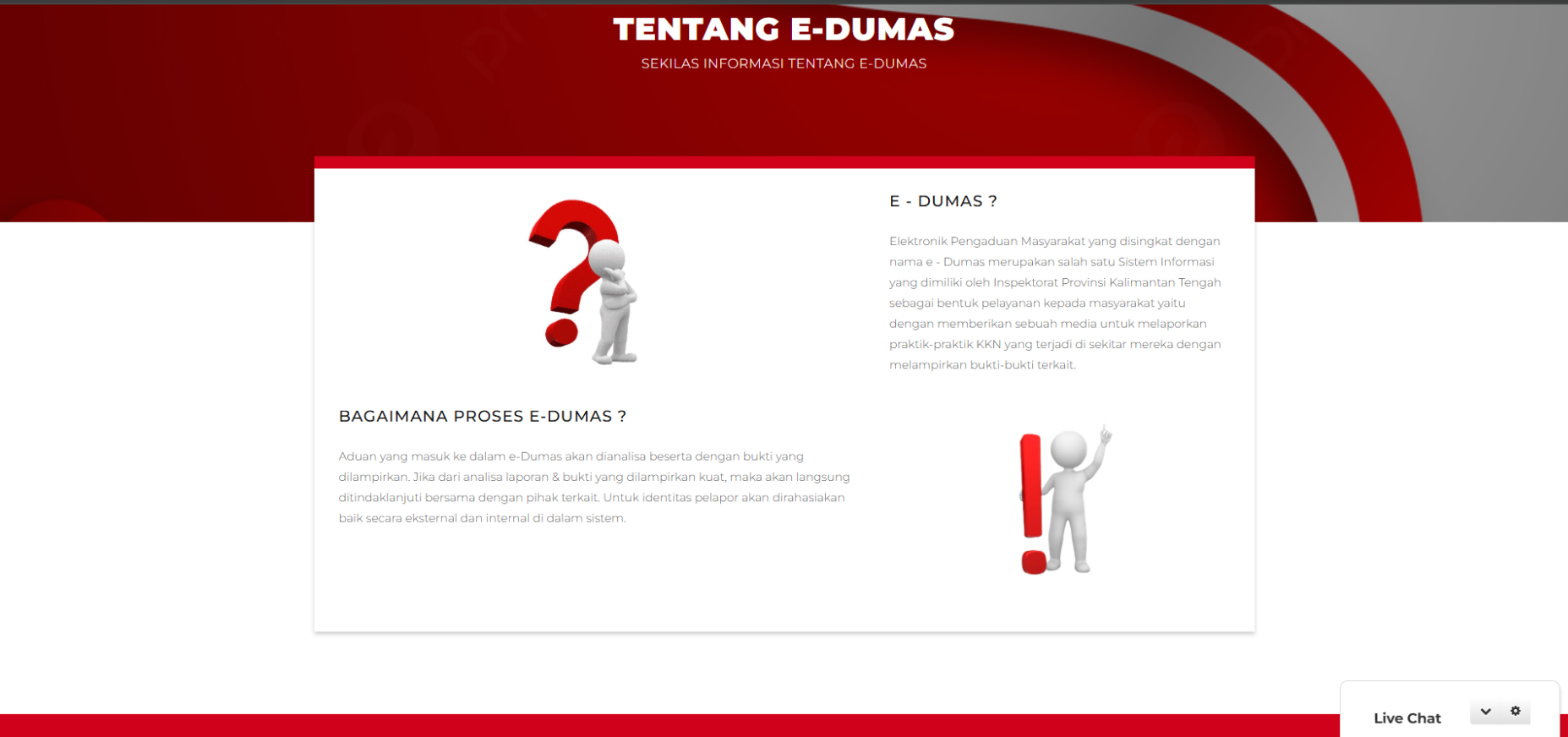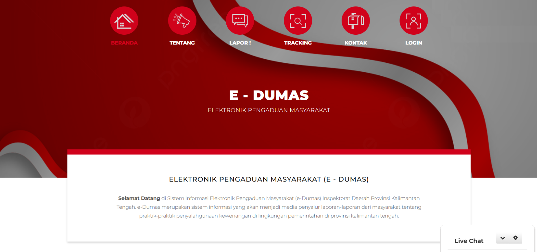 EduMas Kalimantan Tengah merupakan platform pengaduan masyarakat yang dirancang untuk meningkatkan transparansi dan akuntabilitas dalam penyelenggaraan pemerintahan. Melalui layanan ini, masyarakat dapat menyampaikan laporan atau aduan secara online terkait berbagai permasalahan pemerintahan dengan lebih mudah, cepat, dan efisien.