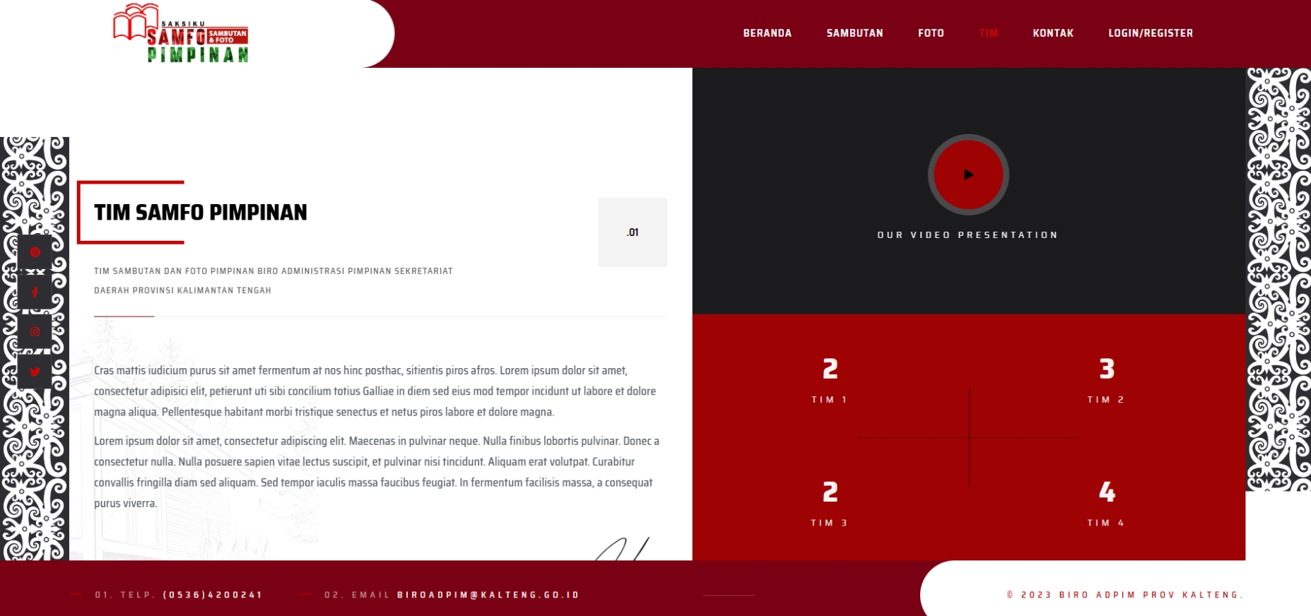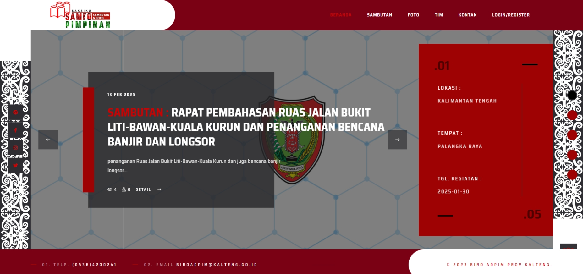 SAMFO (Sambutan dan Foto Pimpinan) – Platform Dokumentasi Resmi Pemerintah Provinsi Kalimantan Tengah adalah sebuah platform berbasis web yang menyediakan akses mudah bagi masyarakat terhadap dokumentasi resmi, termasuk sambutan dan foto kegiatan pimpinan daerah seperti Gubernur, Wakil Gubernur, dan Sekretaris Daerah. Melalui SAMFO, pengunjung dapat mengakses berbagai informasi penting, seperti sambutan resmi yang berisi teks lengkap dari berbagai acara dan kegiatan pemerintahan, galeri foto yang menampilkan dokumentasi visual dari kegiatan pimpinan daerah, serta tim dan kontak yang menyediakan informasi mengenai struktur organisasi Biro Administrasi Pimpinan beserta detail kontak yang dapat dihubungi untuk keperluan lebih lanjut. Dengan desain yang ramah pengguna dan navigasi yang intuitif, SAMFO memudahkan masyarakat dalam mengakses informasi resmi dan terpercaya, serta mendukung transparansi dan akuntabilitas pemerintahan di Provinsi Kalimantan Tengah.