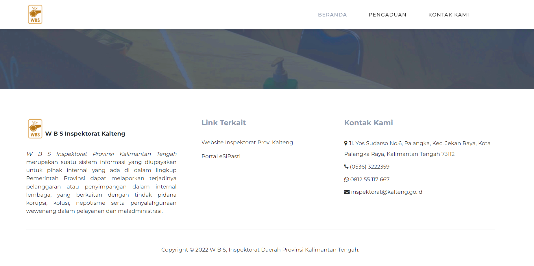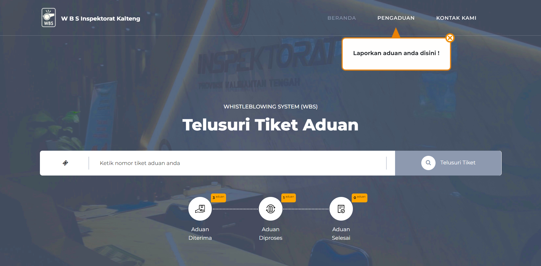 W B S Inspektorat Provinsi Kalimantan Tengah merupakan suatu sistem informasi yang diupayakan untuk pihak internal yang ada di dalam lingkup Pemerintah Provinsi dapat melaporkan terjadinya pelanggaran atau penyimpangan dalam internal lembaga, yang berkaitan dengan tindak pidana korupsi, kolusi, nepotisme serta penyalahgunaan wewenang dalam pelayanan dan mal administrasi